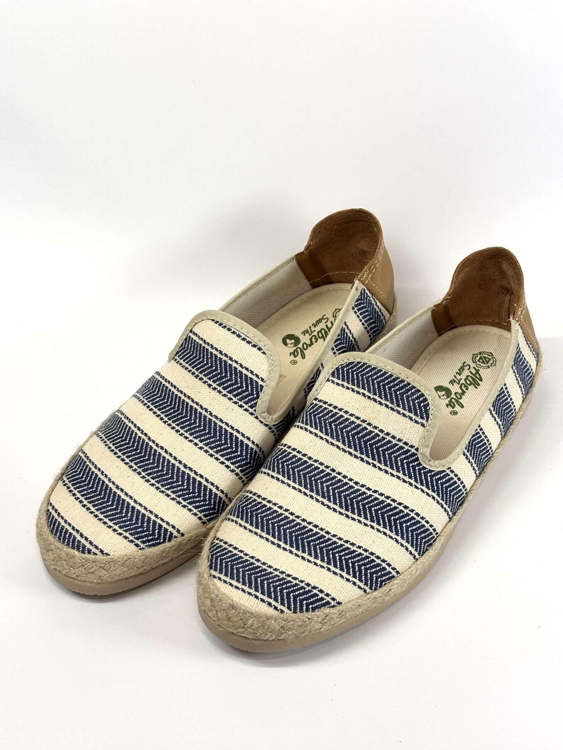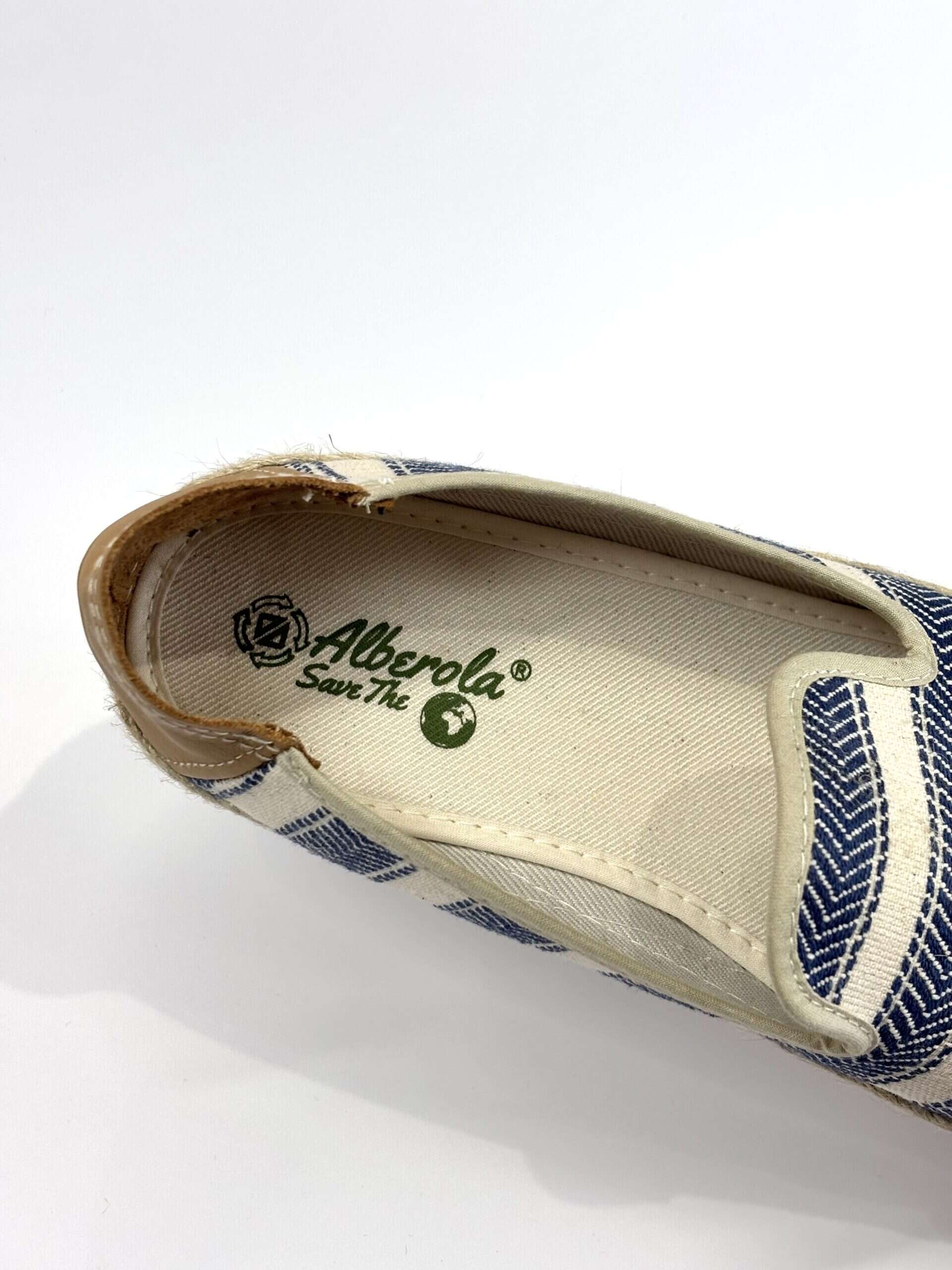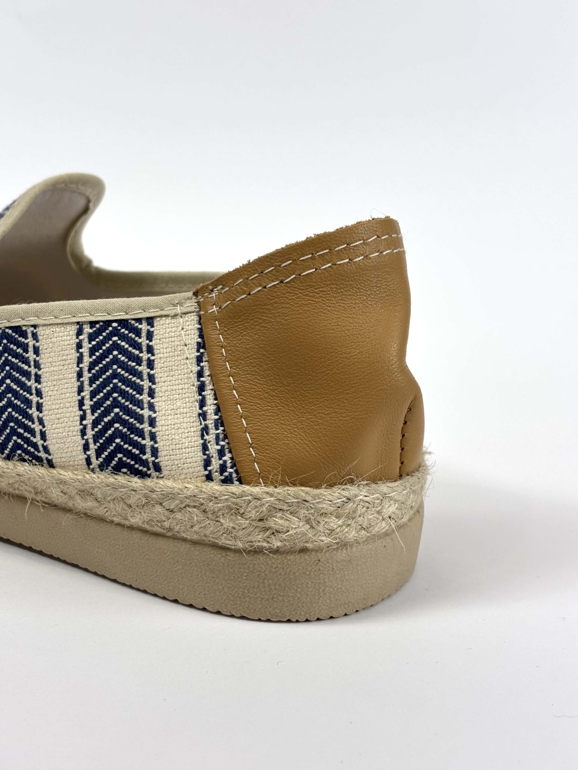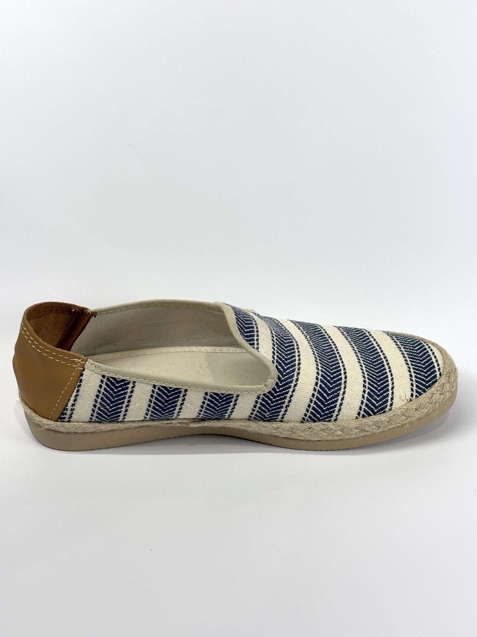 Alpargata sin cordones confeccionada en tejido textil color Nalanda con diseño de rayas en tono azul. Presenta refuerzo trasero en material tipo piel y suela náutico con acabado de yute trenzado, que aporta un estilo fresco y veraniego. Ideal para combinar con looks informales en temporada de buen tiempo.
