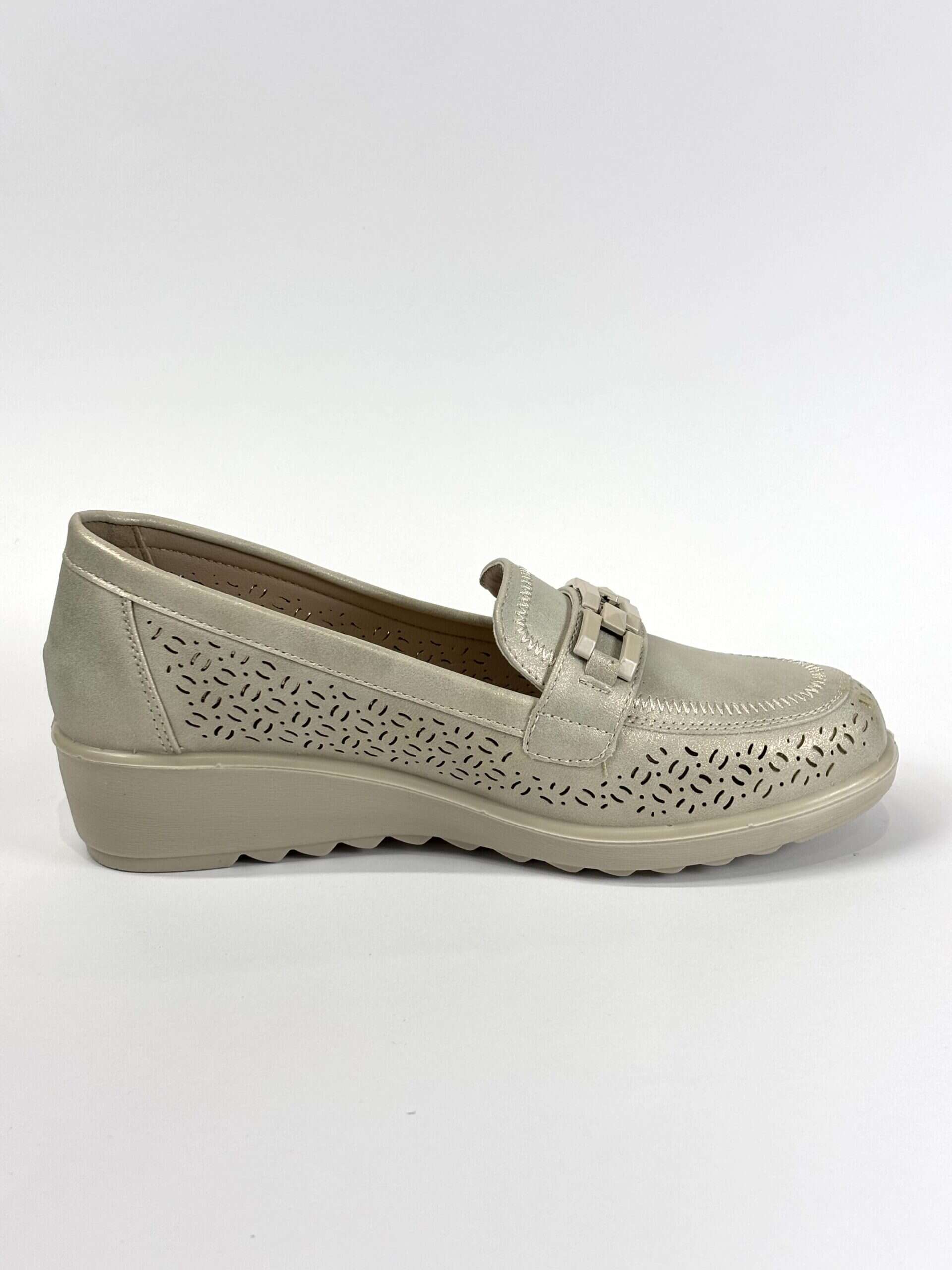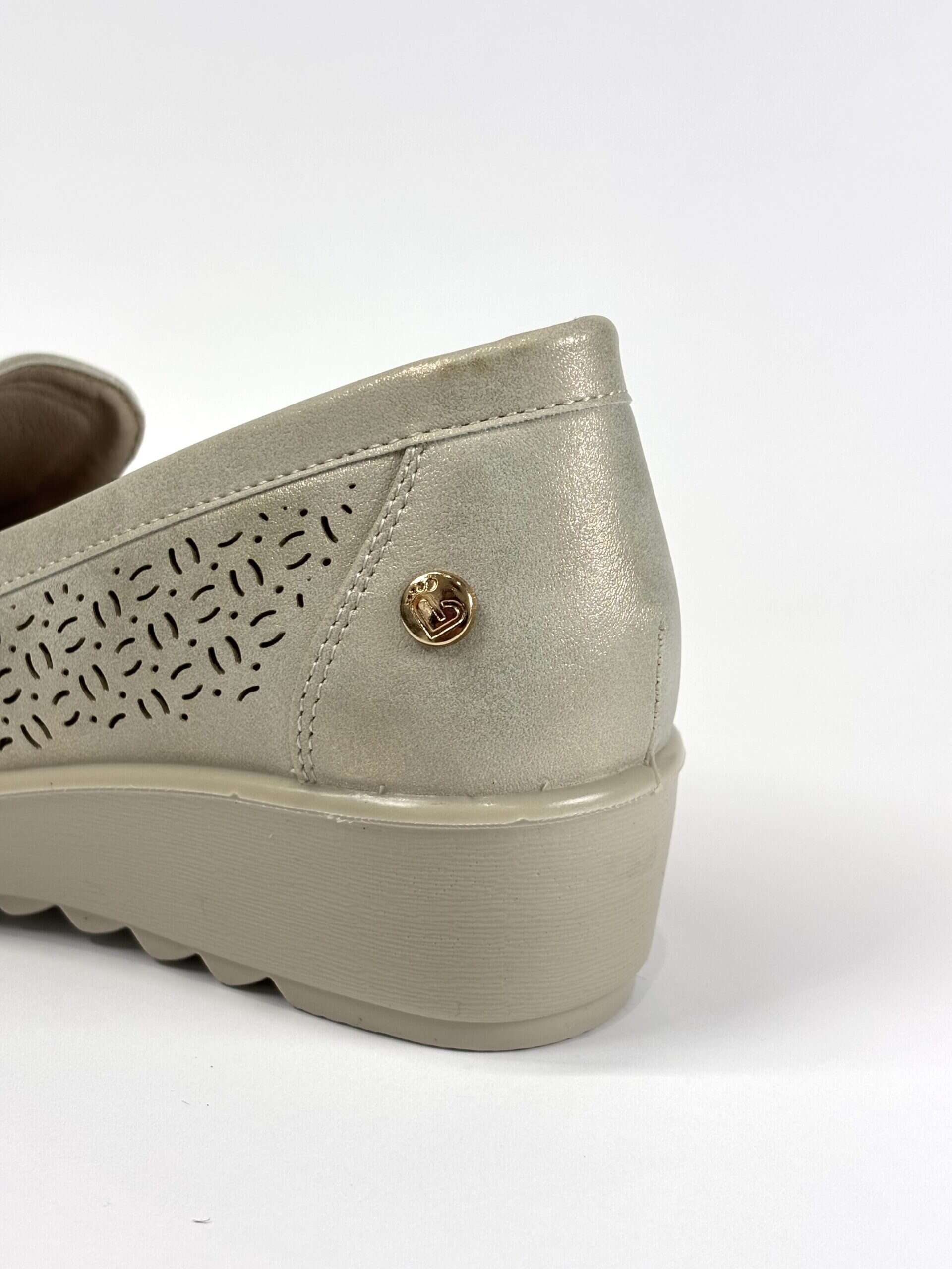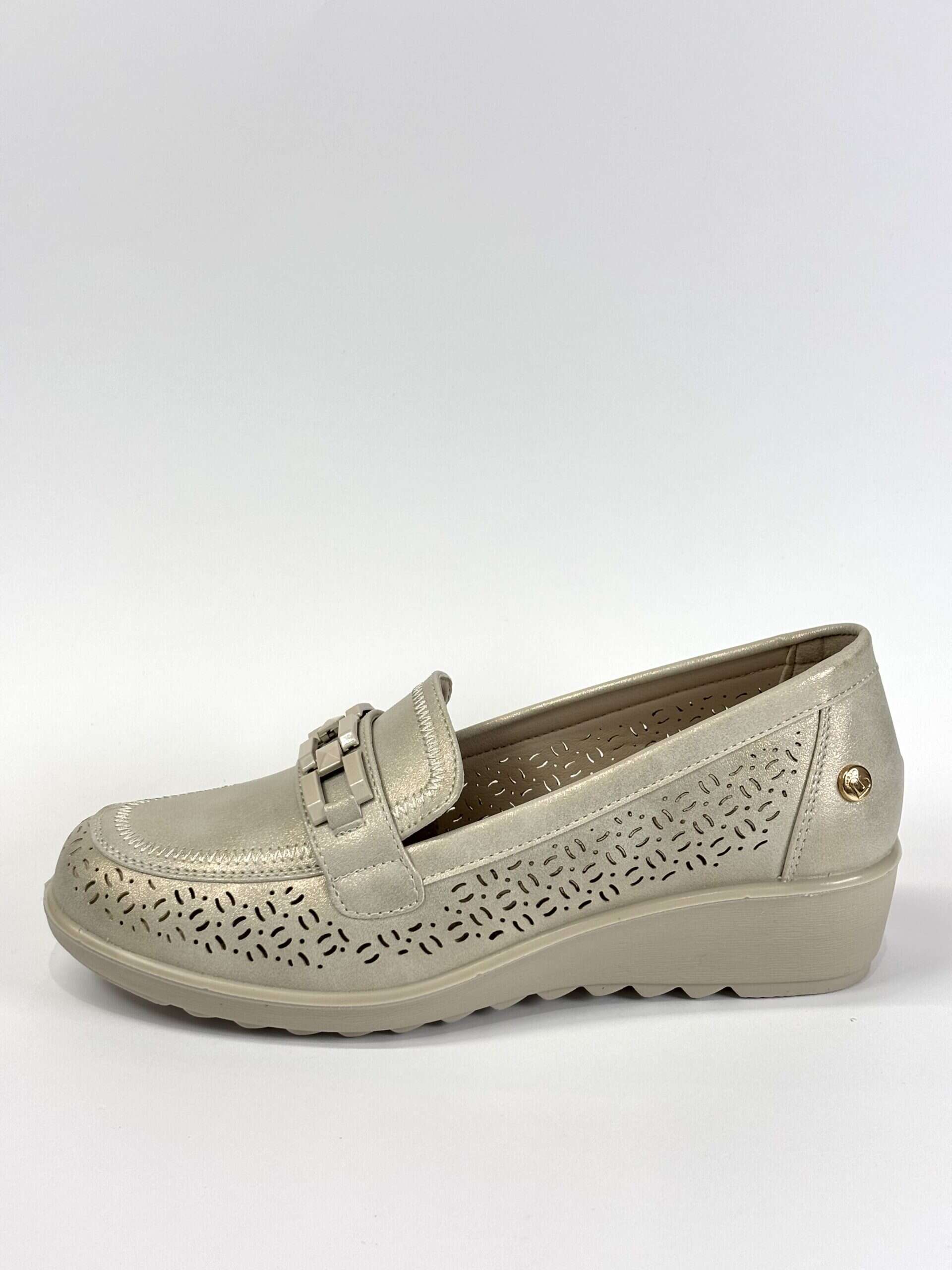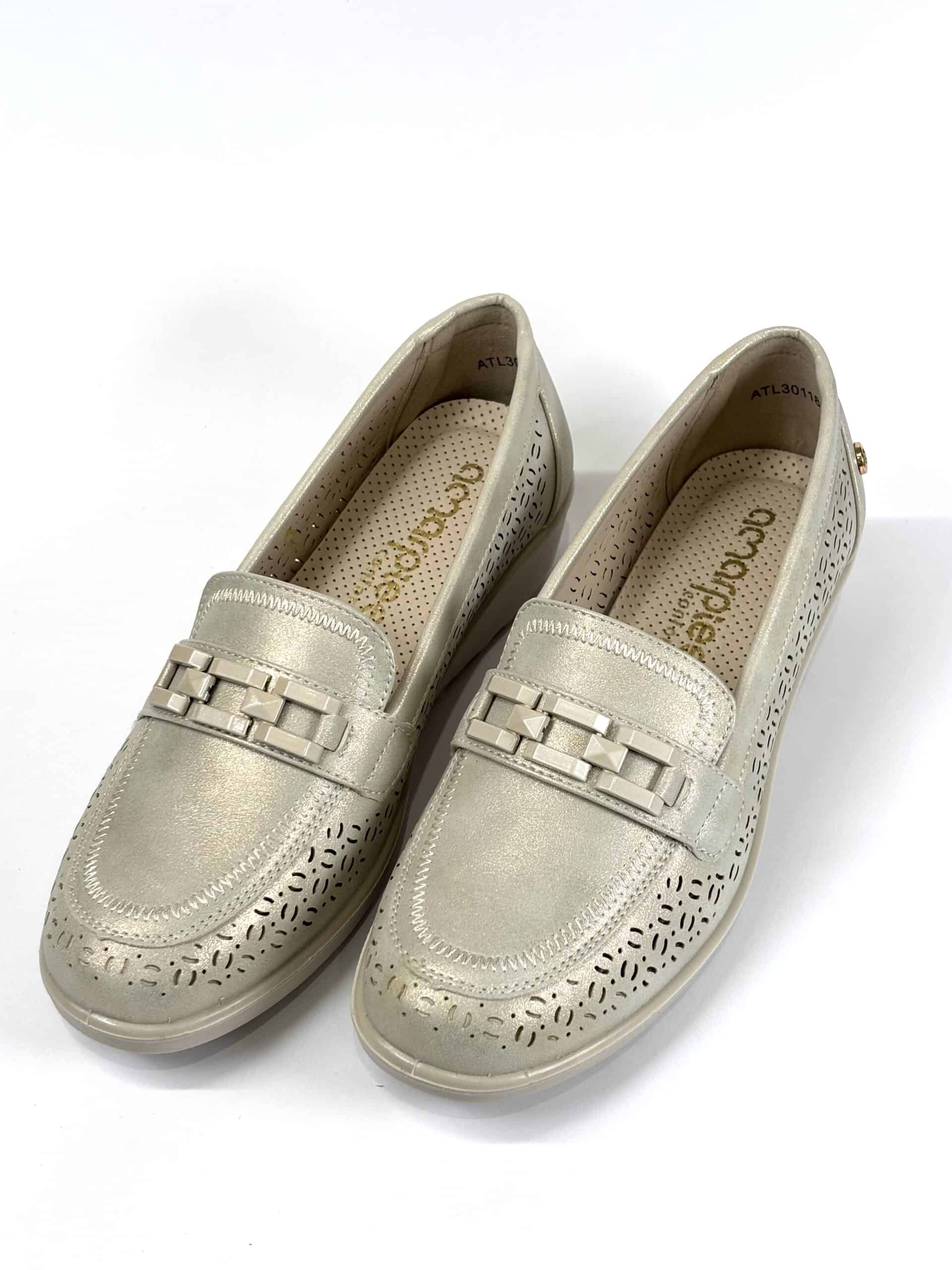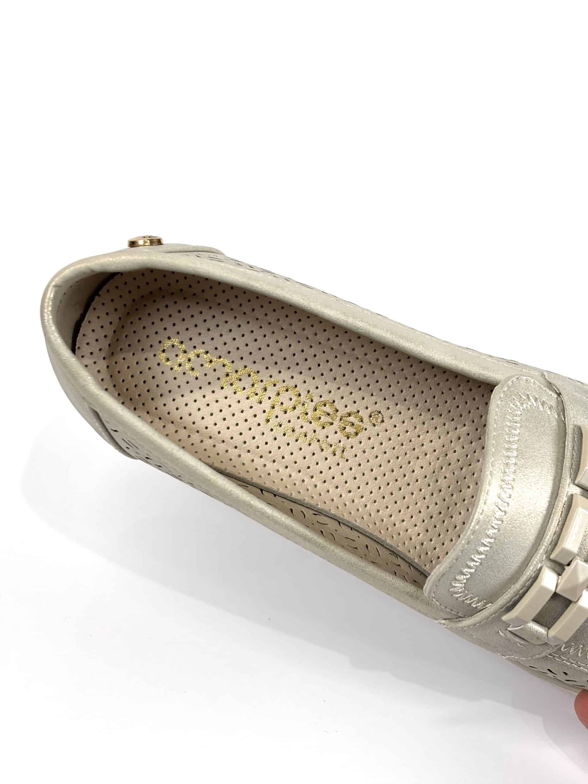 Mocasín de mujer de la marca Amarpies en tono plateado, con acabado ligeramente metalizado y diseño troquelado en la puntera que aporta  transpirabilidad. Presenta detalle decorativo en el empeine que le da un toque moderno y elegante. Incorpora una ligera cuña que ofrece un extra de comodidad y favorece la pisada.