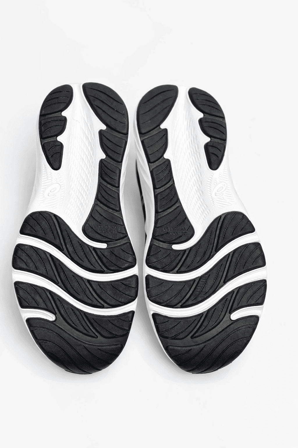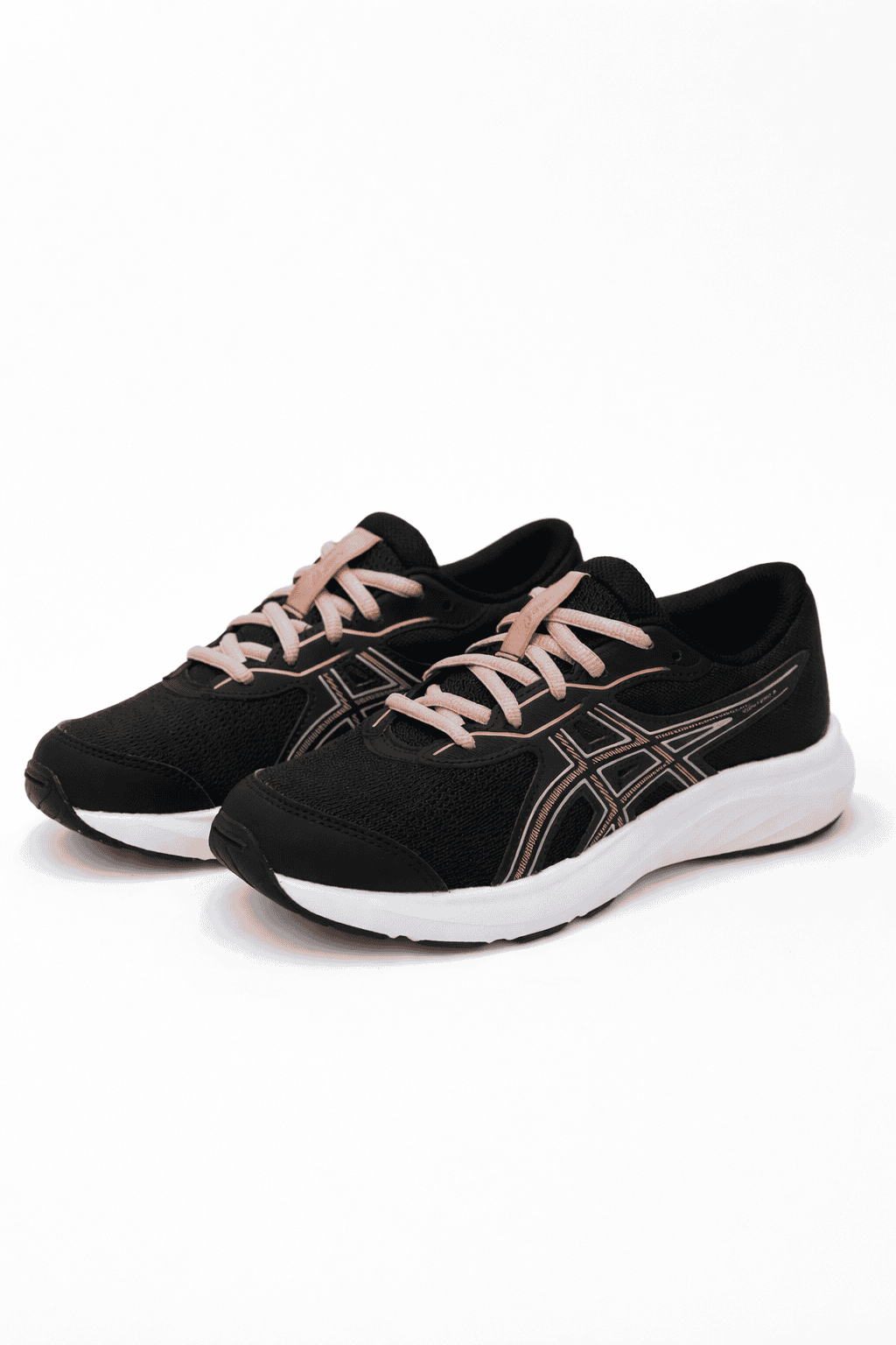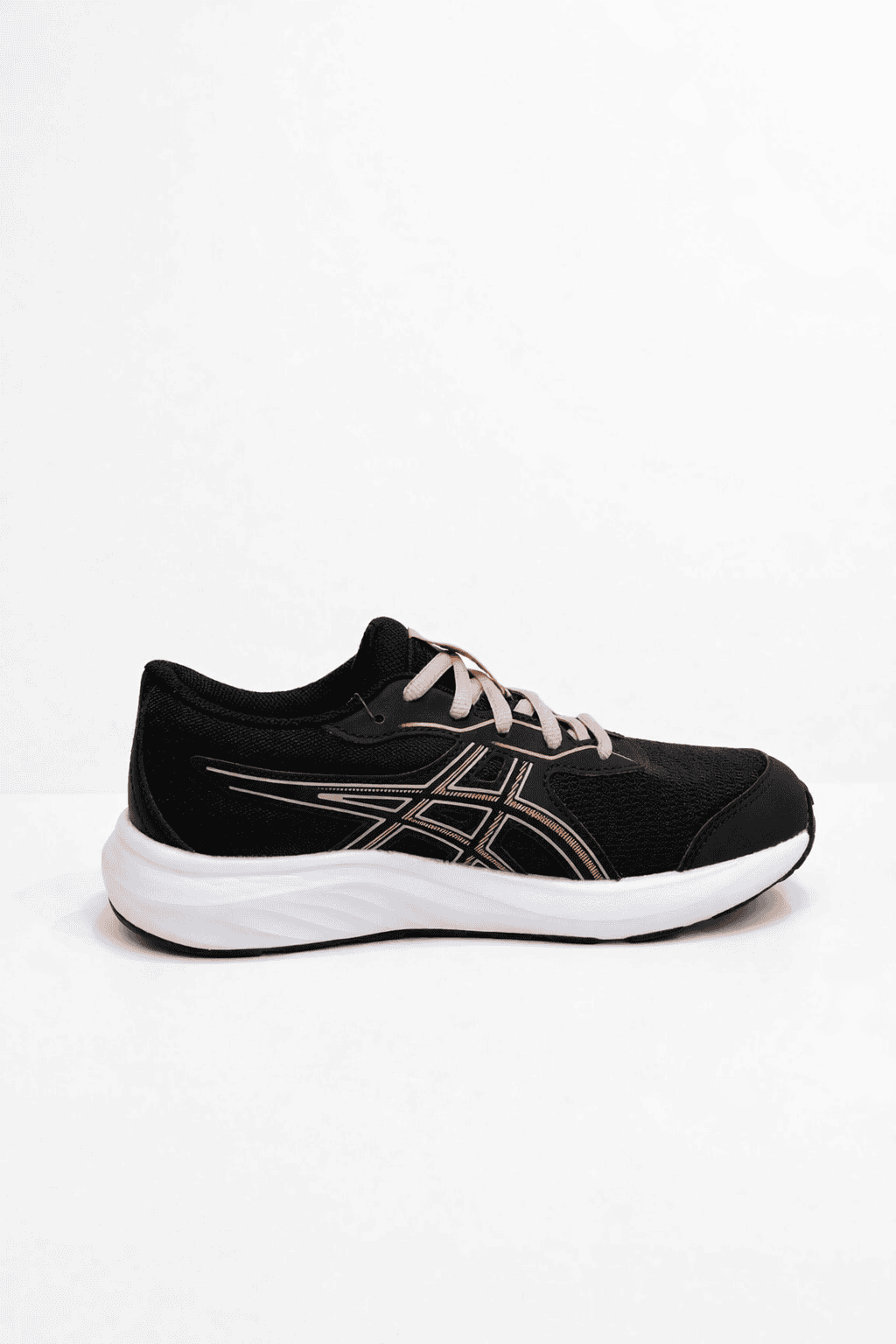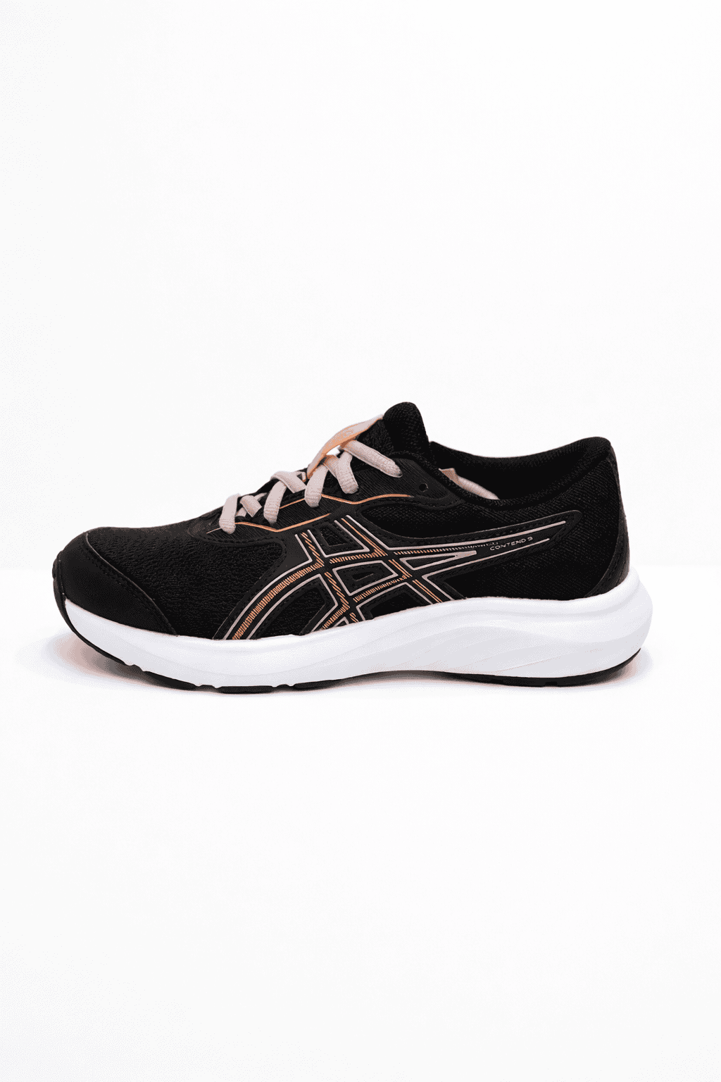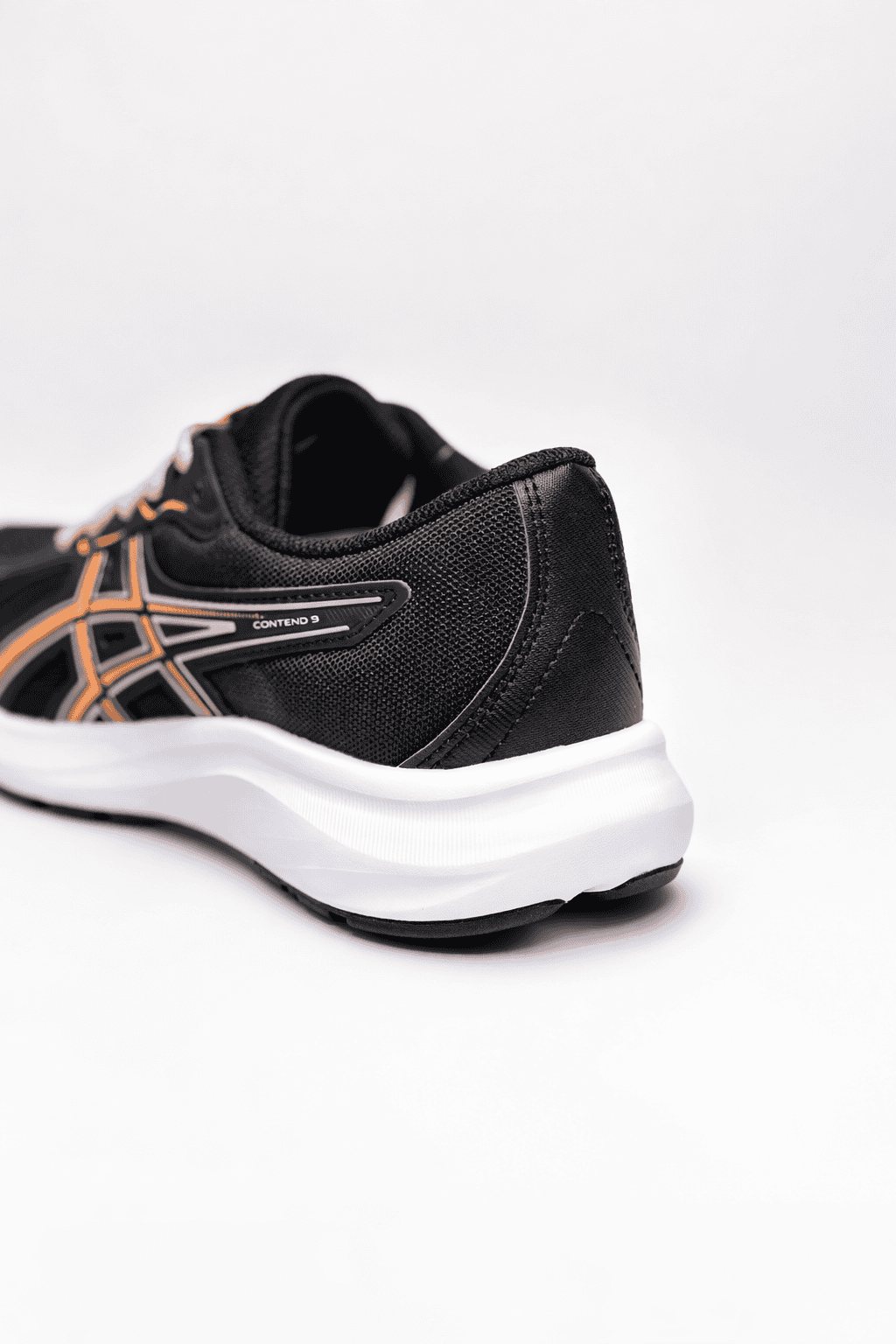 Zapatilla deportiva de estilo running en color negro con detalles en naranja. Presenta un upper de malla transpirable que aporta ligereza y ventilación, con refuerzos sintéticos laterales que ofrecen mayor sujeción. Incorpora cordones en color rosa claro que contrastan con el diseño y una mediasuela blanca gruesa que brinda comodidad y amortiguación. Ideal para uso diario o actividades deportivas ligeras.