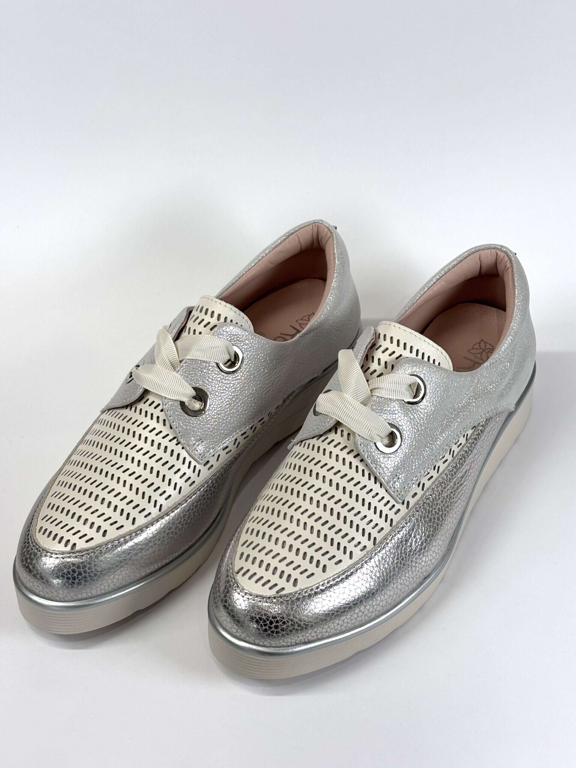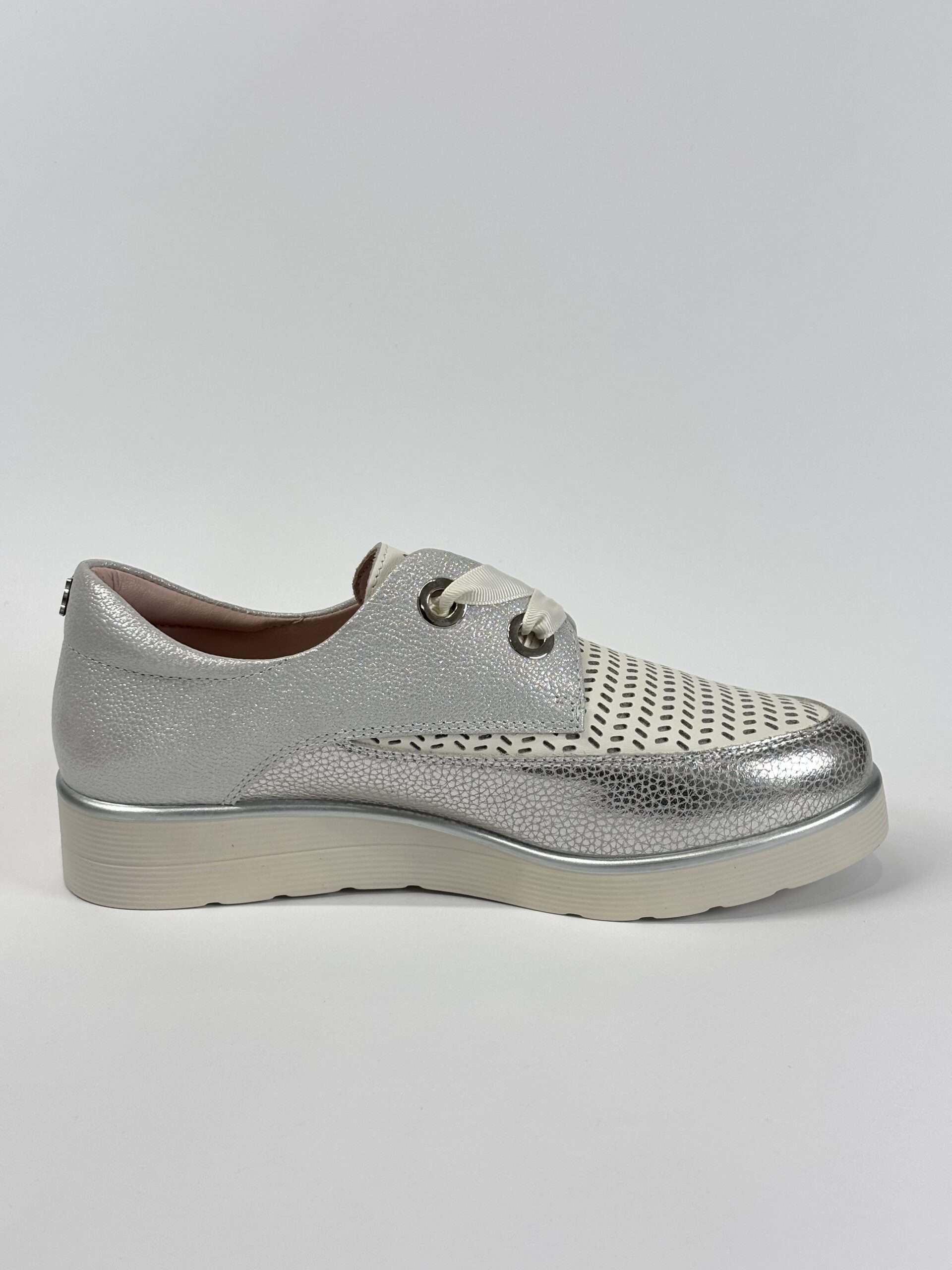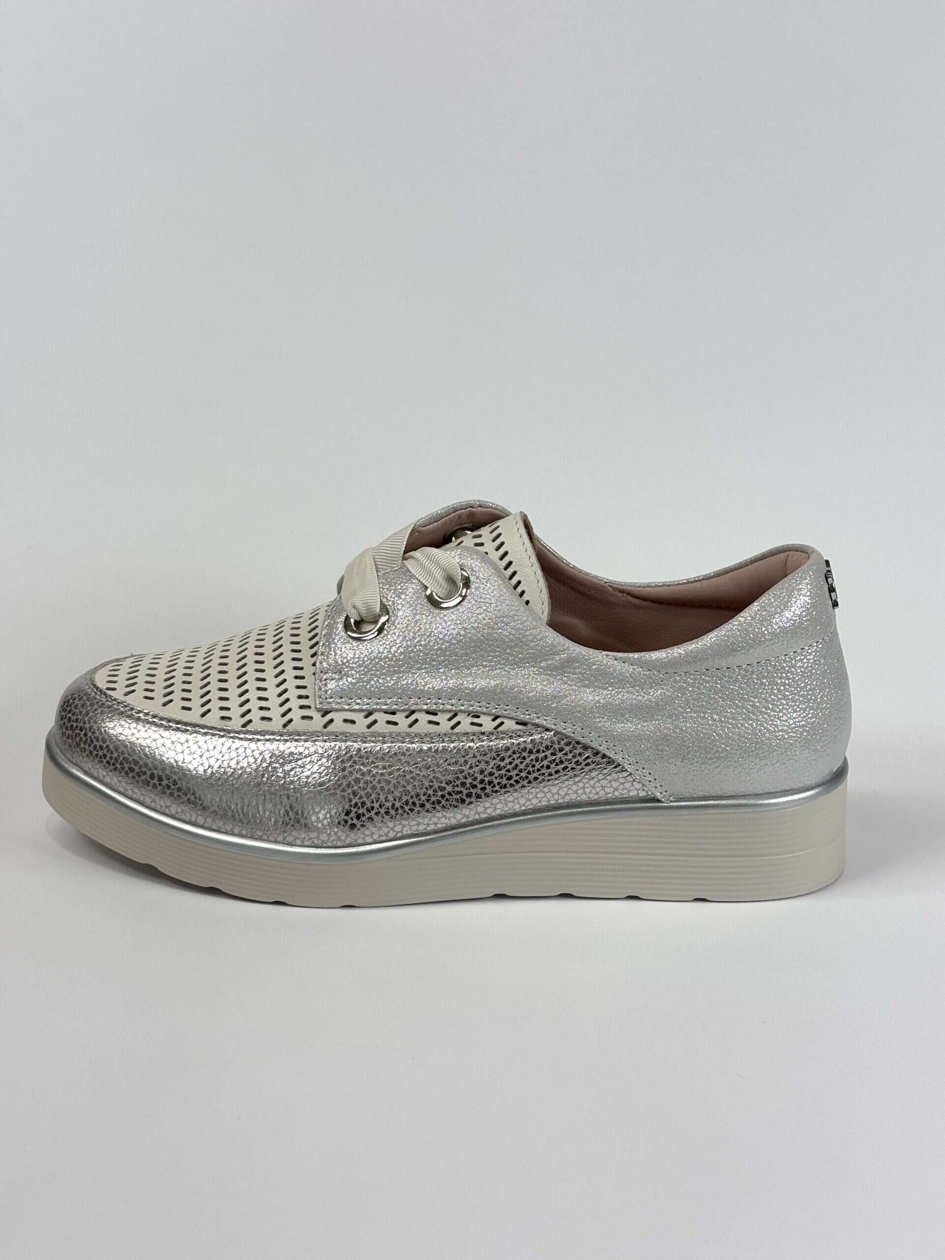 Zapato con suela robusta y combinación de texturas: Este elegante zapato combina varias texturas para un resultado visual impactante. Destacan sus tres grandes ojales con lazada de cinta y su gruesa suela con diseño en capas. ¡El zapato perfecto para añadir un toque moderno y cómodo a tu día a día!