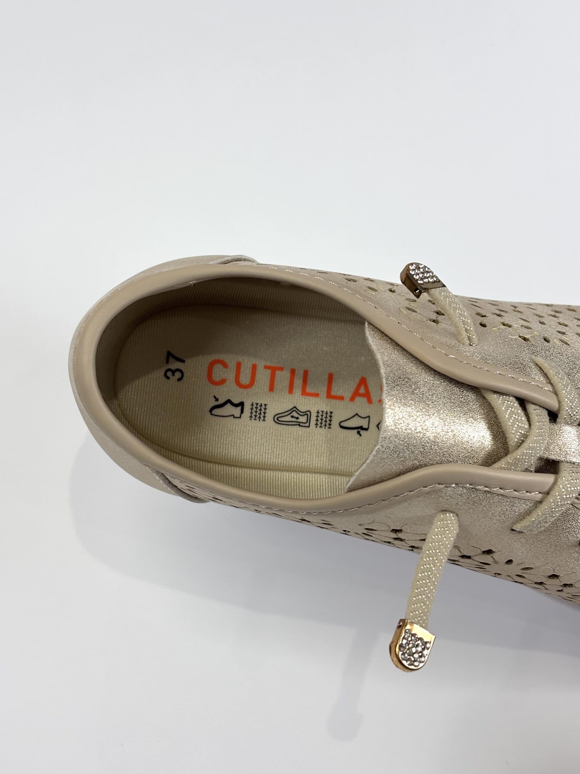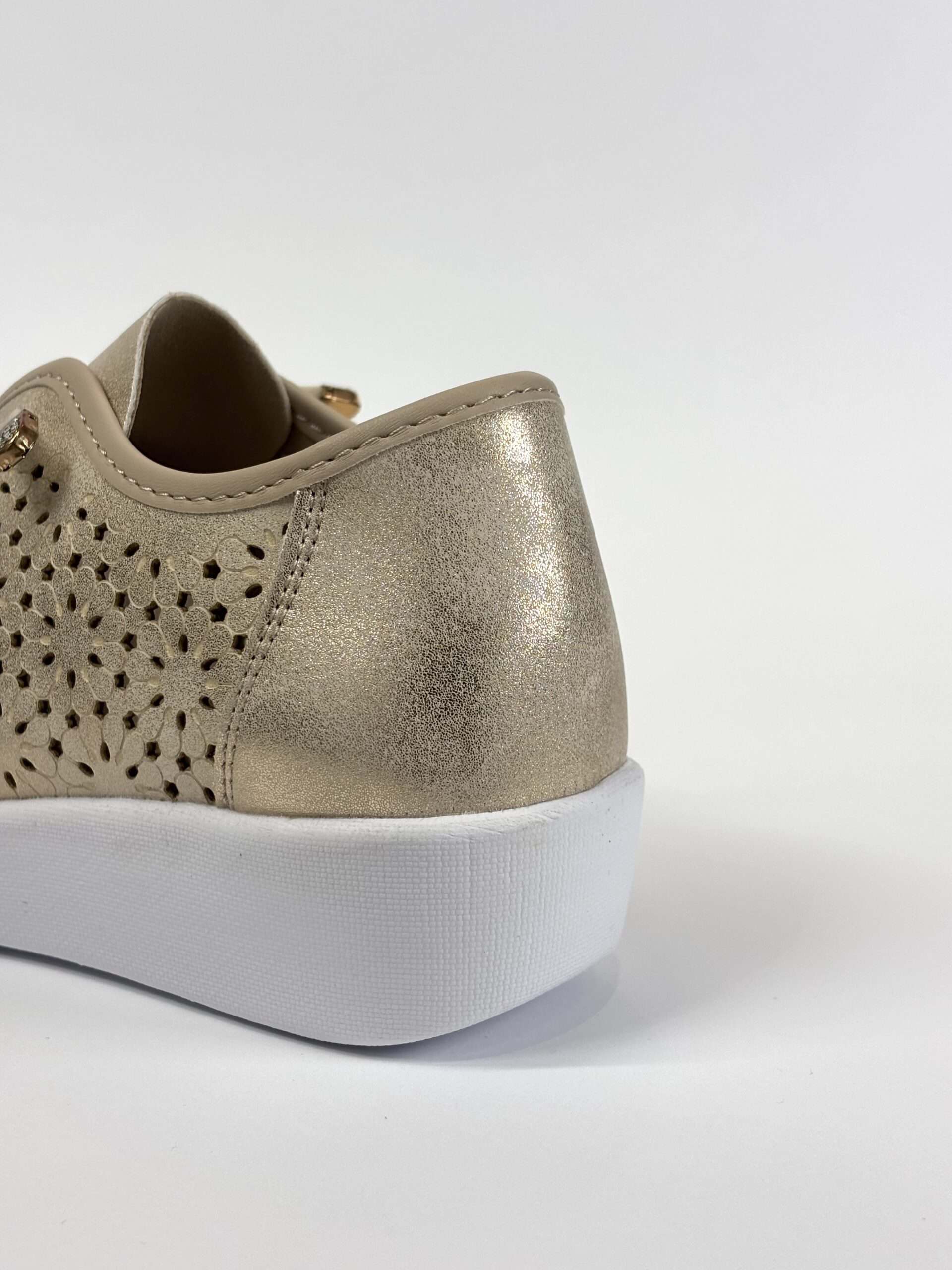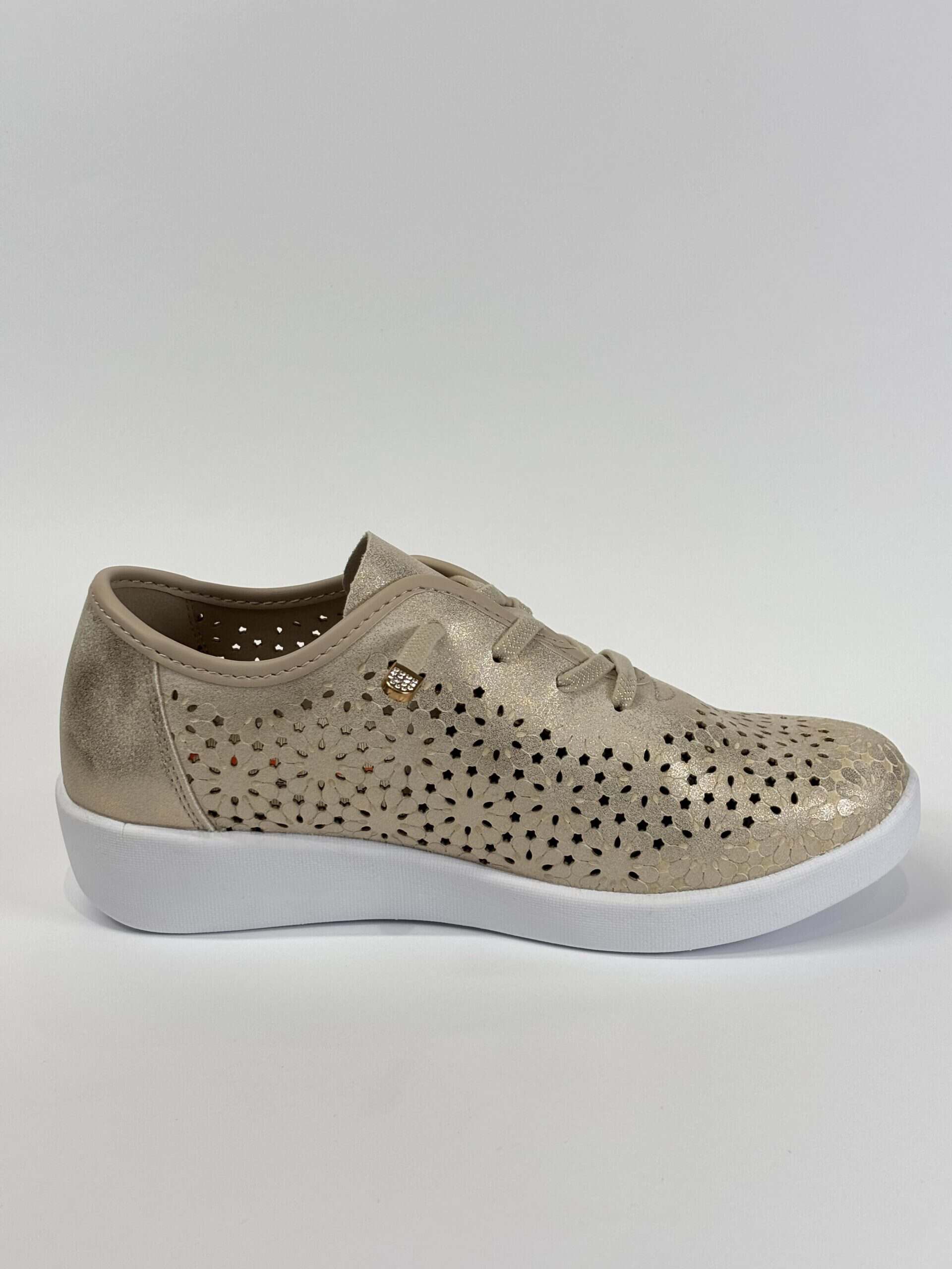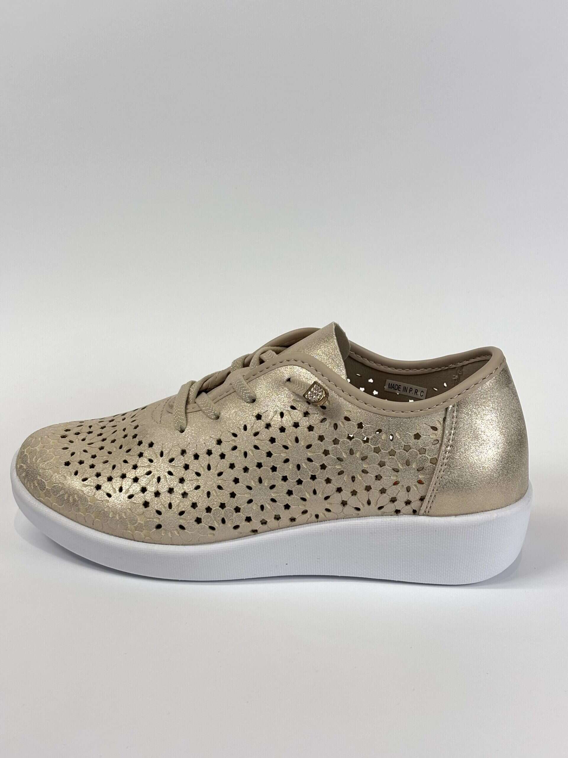Deportivo para mujer tipo inglés con picados láser en color champagne con destellos dorados. Cuenta con talón reforzado, cierre de cordones elásticos, plantilla extraíble y suela de goma súper ligera. El material picado favorece la transpiración del pie en los días más calurosos.