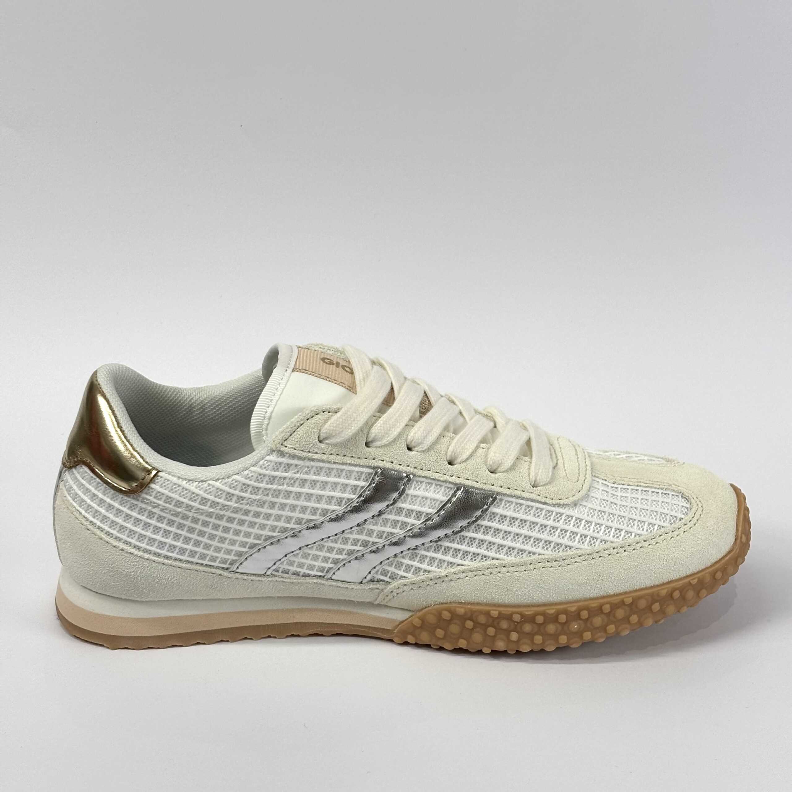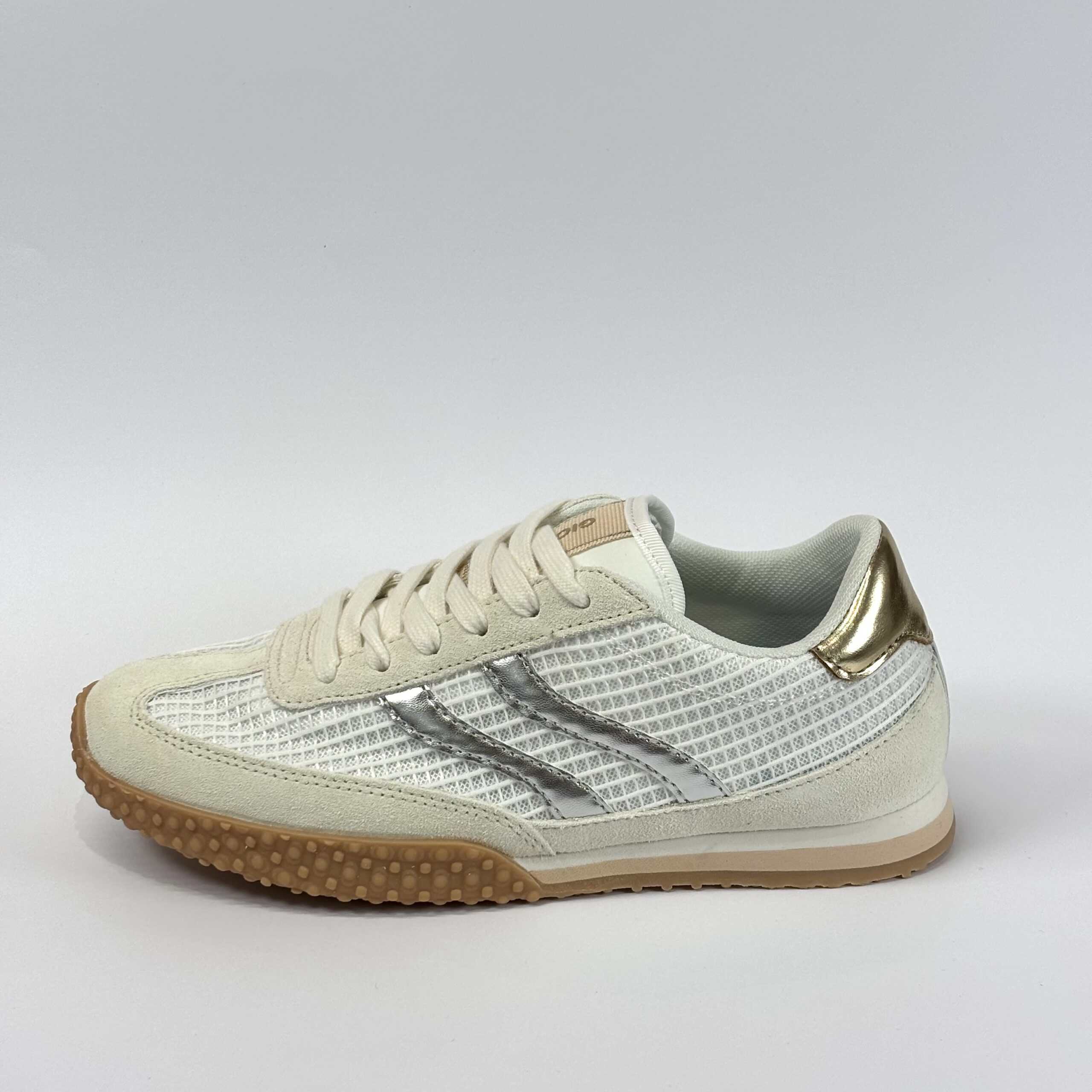 Zapatillas con piel serraje, rejilla superpuesta y acentos metalizados. Suela granulada. Cuentan con plantilla acolchada y extraíble. Altura plataforma: 2 cm.