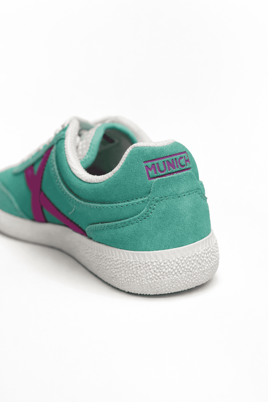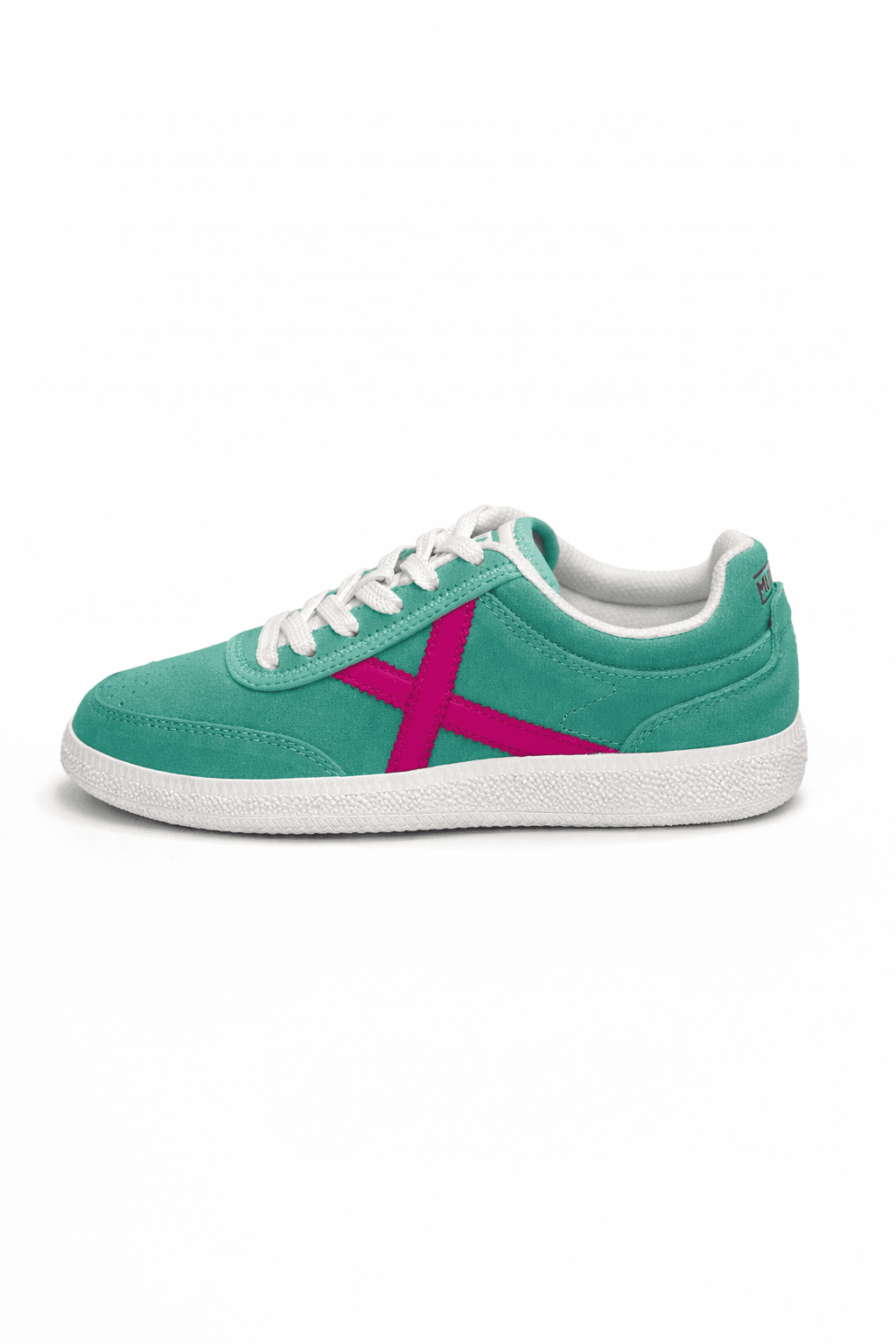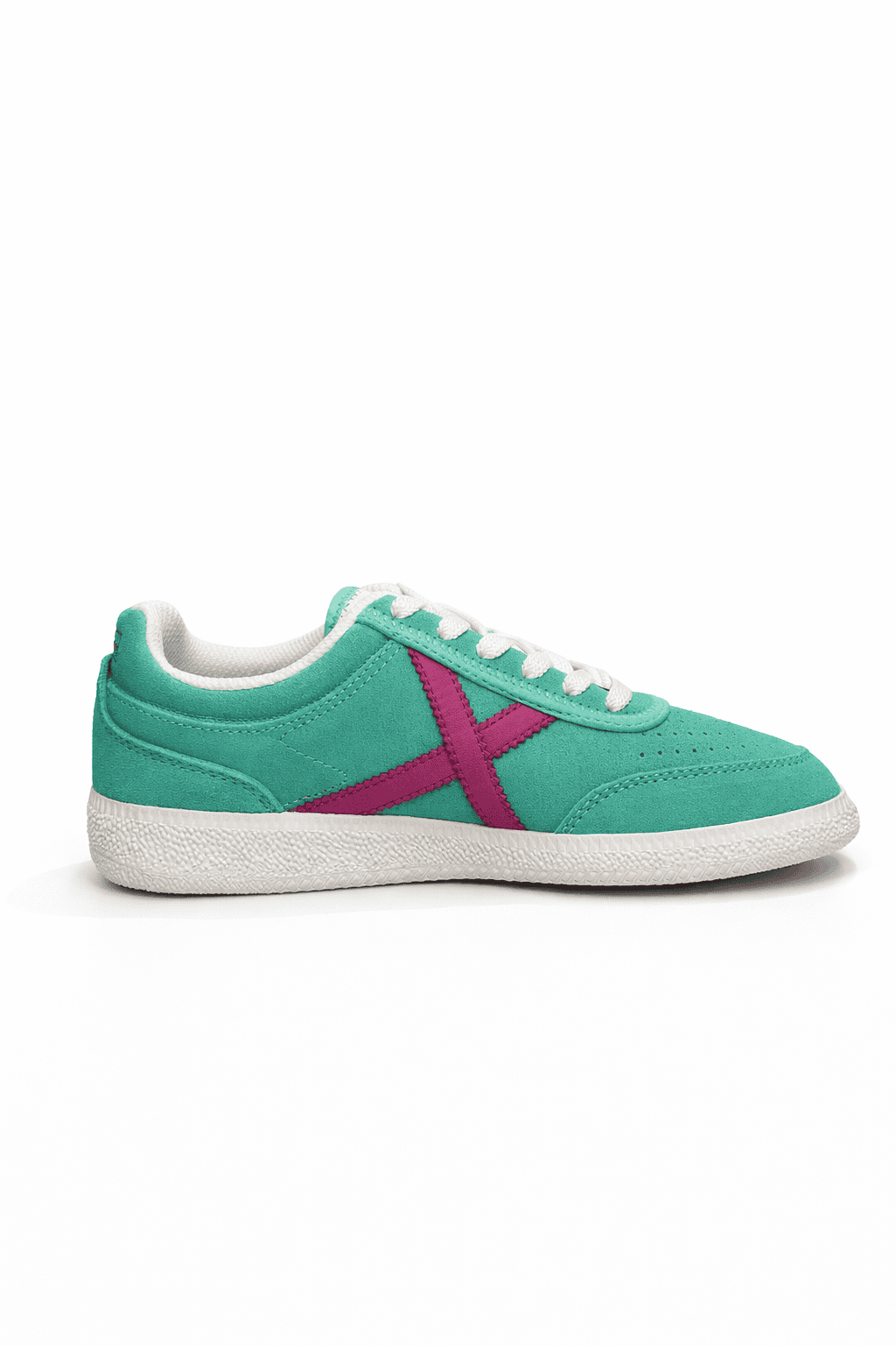 RUMBA en piel de ante verde agua, con la icónica X lila y suela blanca retro, combina frescura, estilo y comodidad. Perfecta para looks casuales, citas informales o añadir un toque pastel chic a tu día a día.