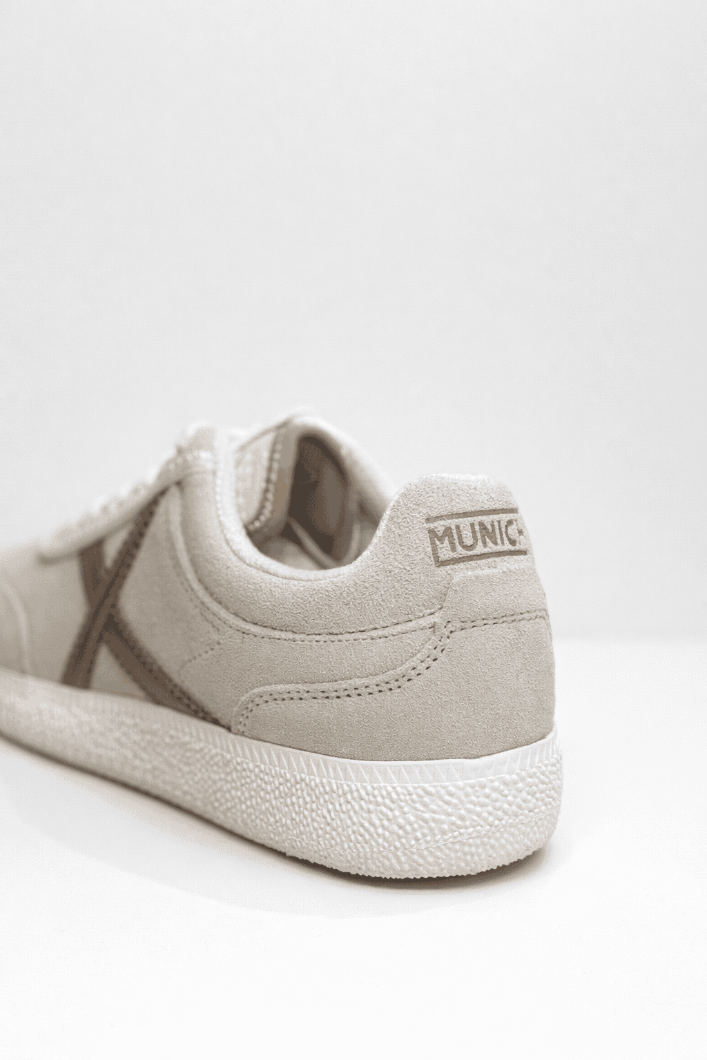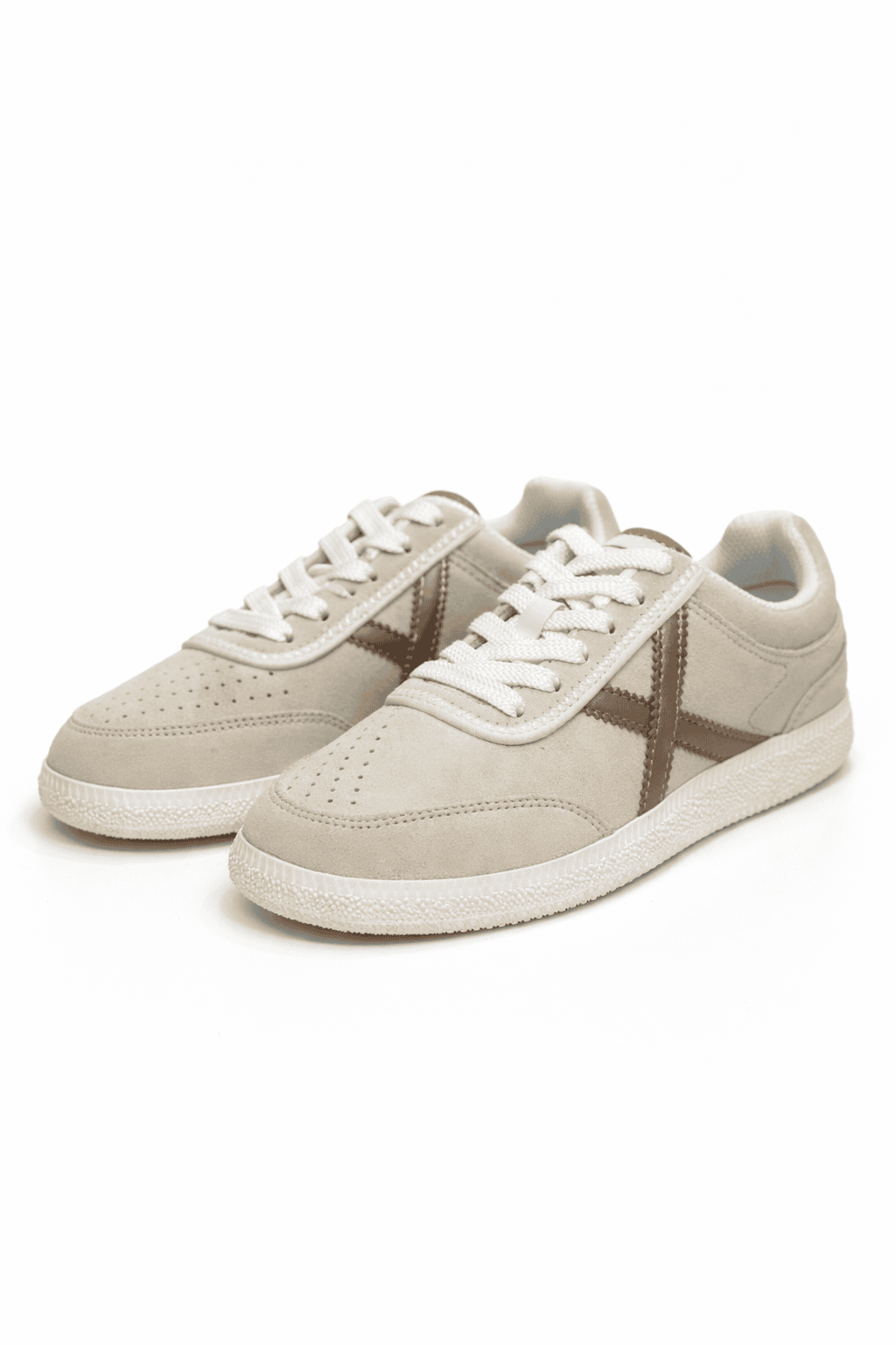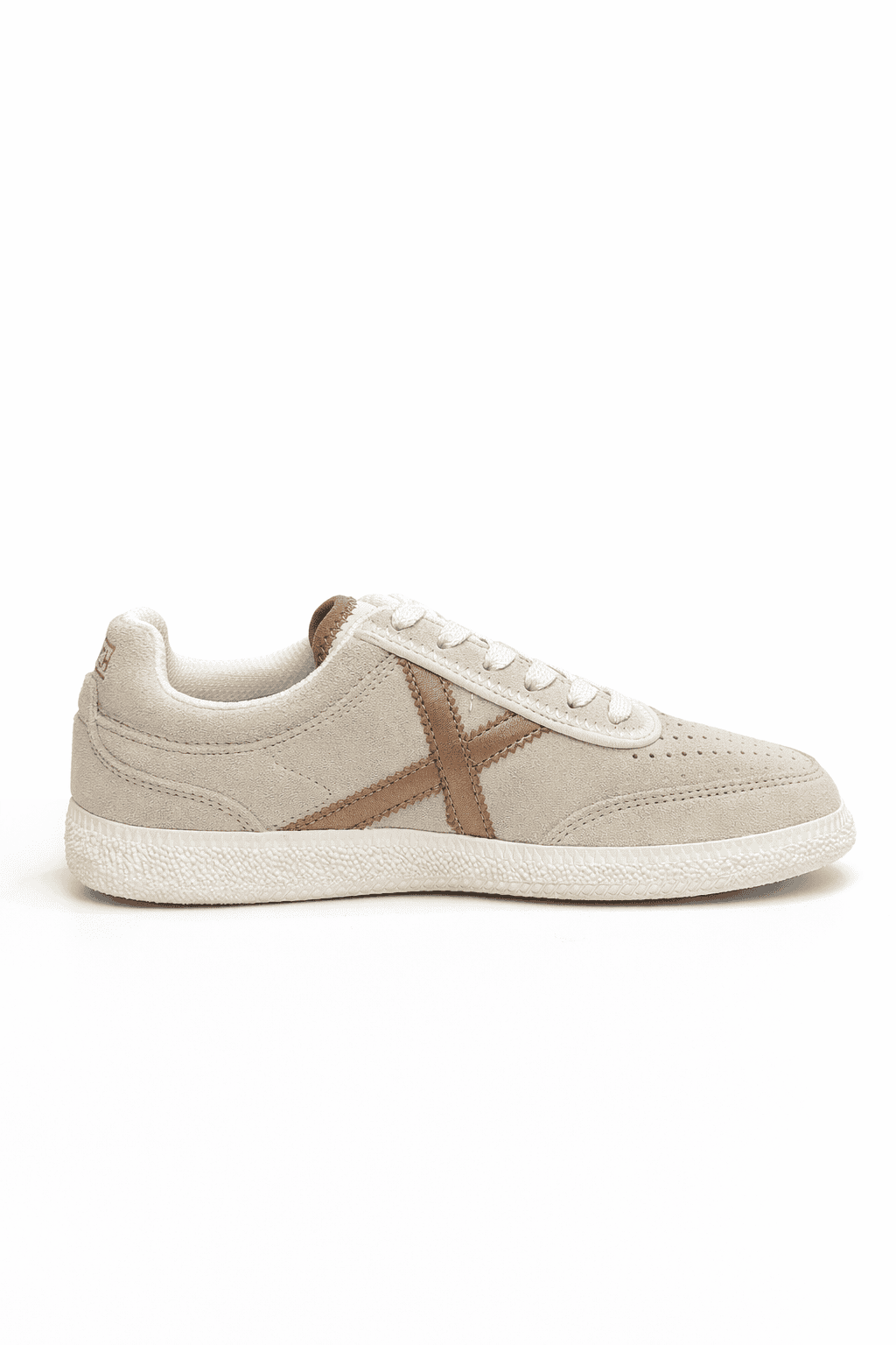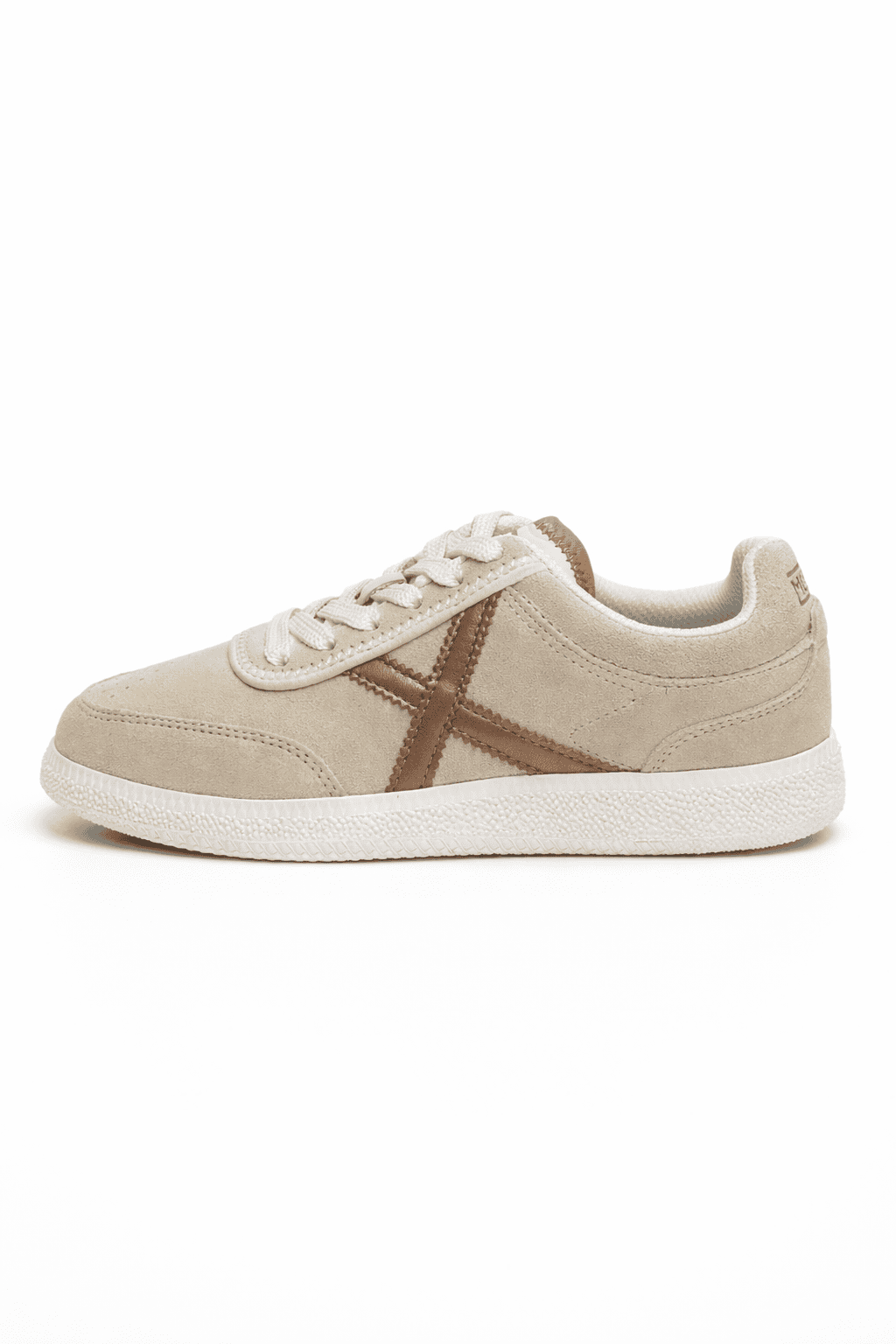 RUMBA es un calzado femenino en piel de ante crema, con la icónica X en oro rosa y suela blanca retro. Combina elegancia sutil y estética deportiva minimalista, ideal para looks casuales, comidas informales o añadir un toque chic a tu día a día.