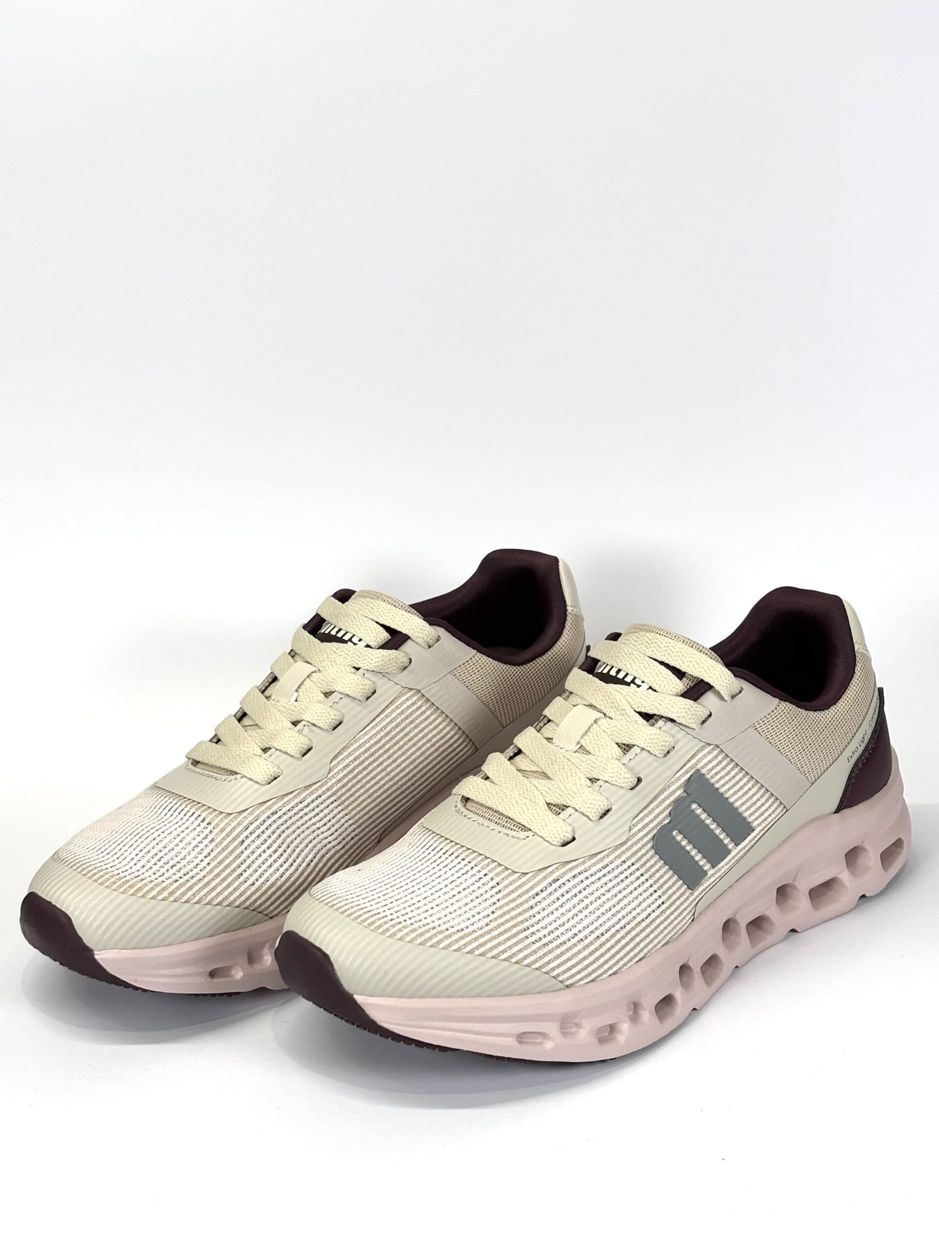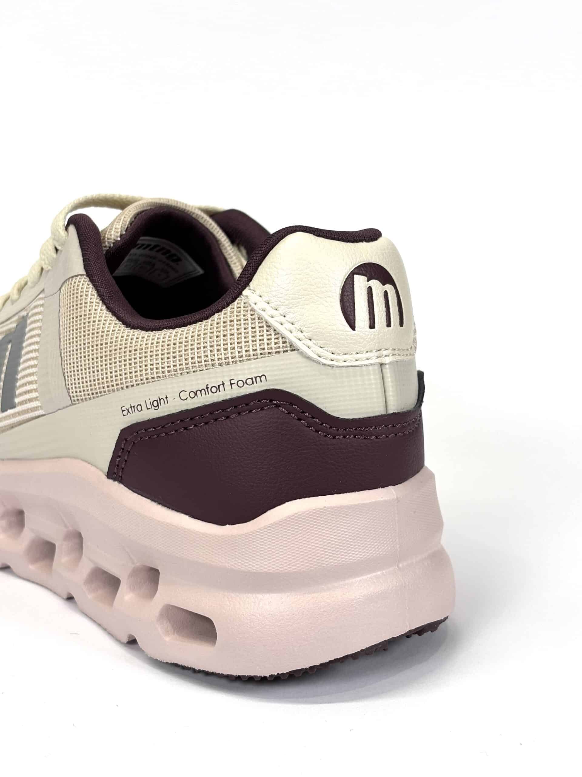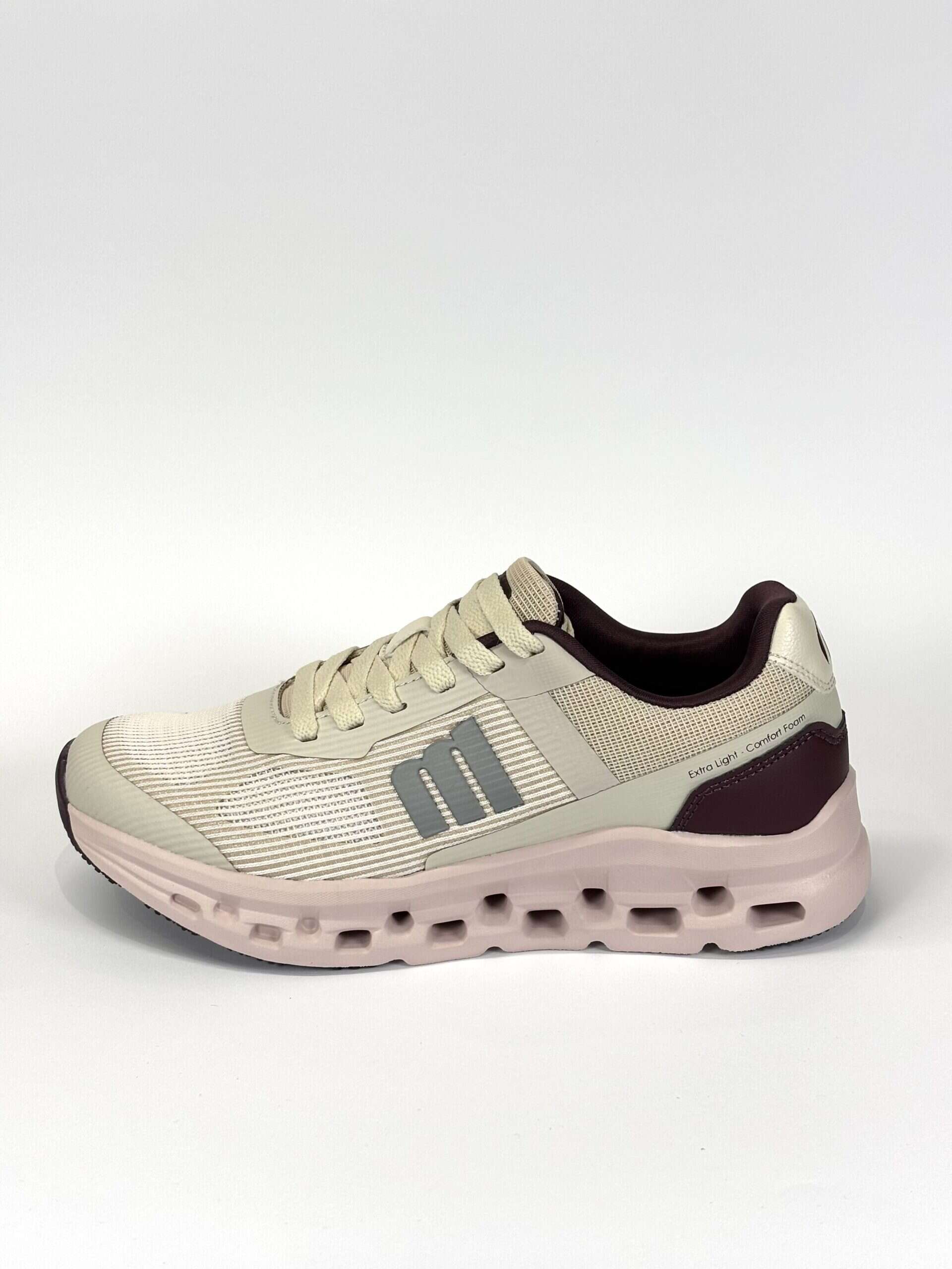 Zapatilla de color beige para mujer de la marca Mustang, modelo Game de estilo deportivo. Su tejido técnico con acabado en tonos suaves combina beige, burdeos, gris y rosa. Cuenta con plantillas con tecnología Starfit, que mejoran la comodidad en cada paso, y suela gruesa con tecnología Extralight, lo que las hace más ligeras. Con certificado VEGANO sellado por INESCOP, el cual garantiza que la naturaleza química principal del material no se corresponde con fibras de origen animal.